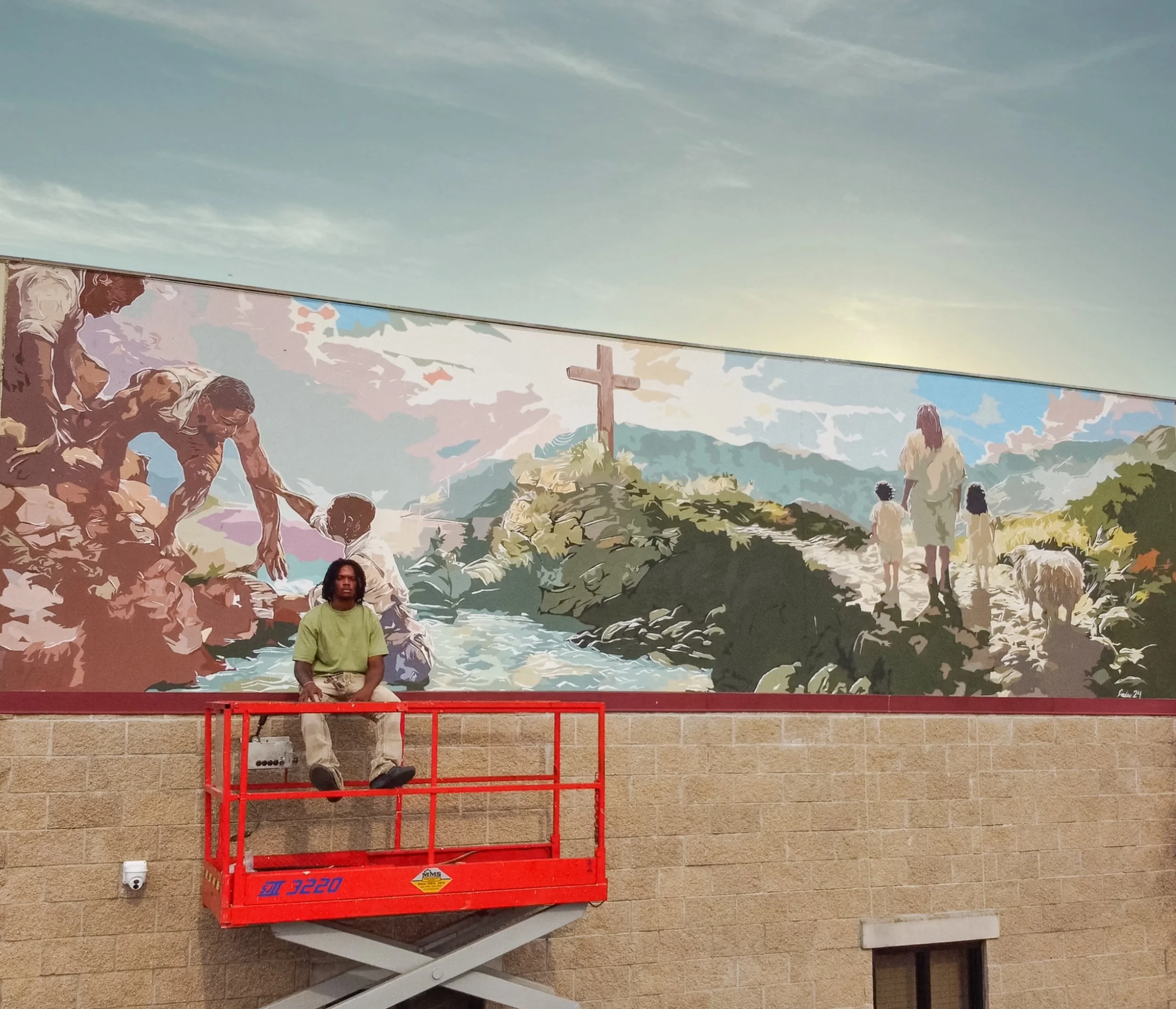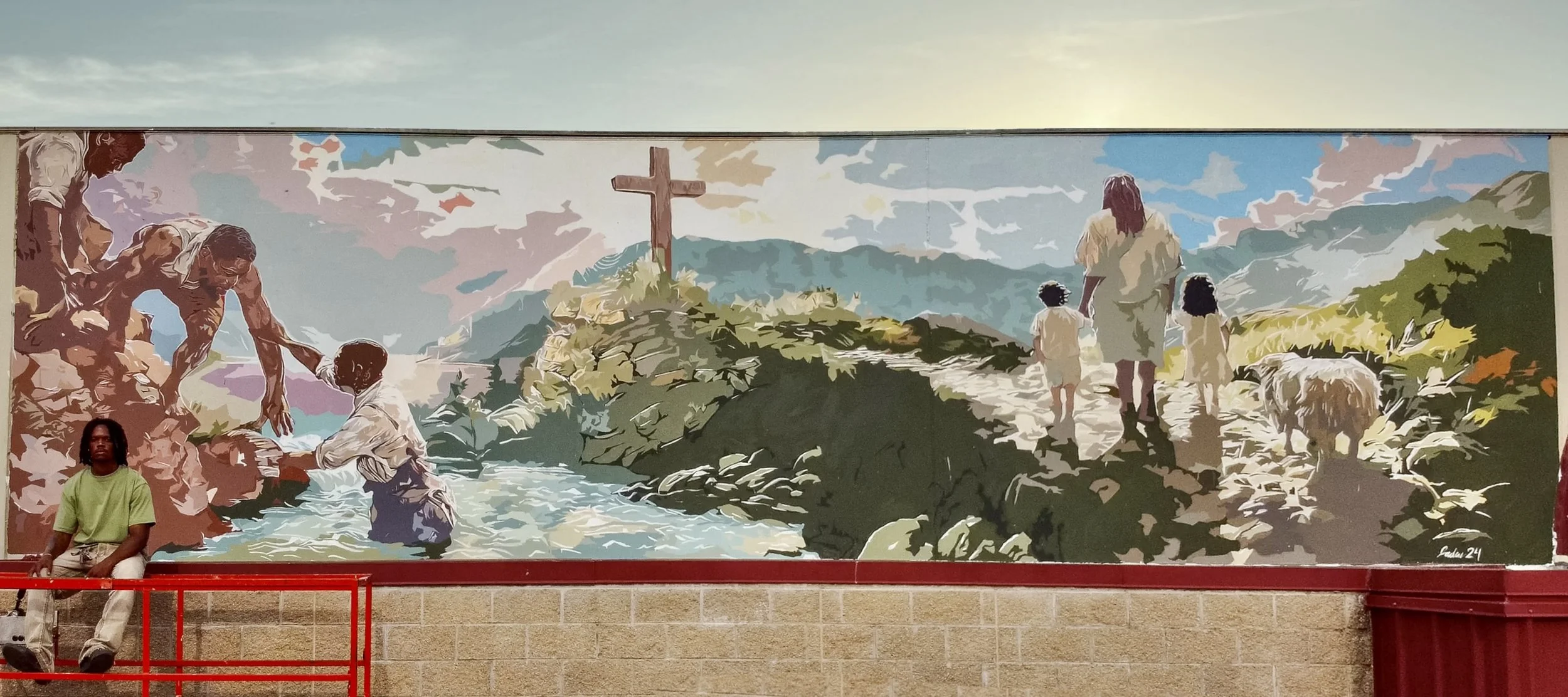 This mural is inspired by Micah 6:8, which calls us to do justice, love mercy, and walk humbly with God. On the left, two men reach down to pull another from the water, a powerful image of justice in action and the responsibility to lift one another up. At the center, the cross symbolizes God’s ultimate act of mercy and love through sacrifice. On the right, Jesus walks alongside two children and a lamb, a reminder of humility, trust, and the call to follow God with childlike faith.